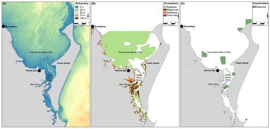 Figure 11. (A) Bathymetry, (B) marine ecosystems, and (C) marine reserves in coastal waters abutting K’gari [54,134,139,140].
