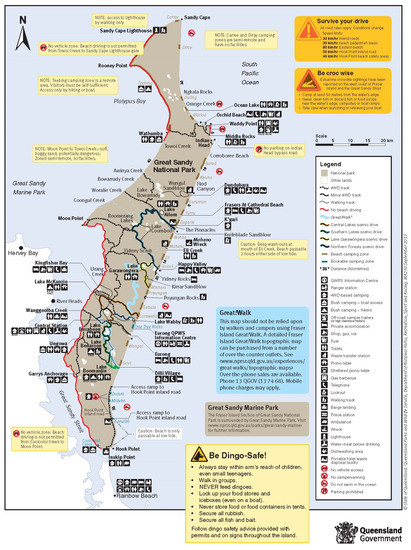 Figure 13. Great Sandy National Park: key sites, camp zones, tracks, and beaches prohibited for vehicles [176].