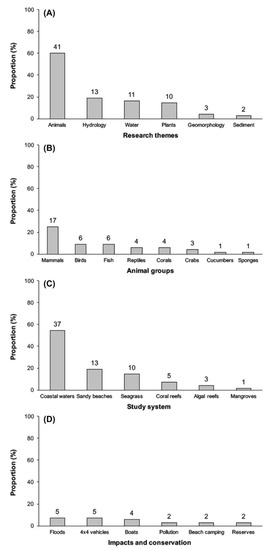 Figure 15. Summary of marine research in coastal waters abutting K’gari (Hervey Bay, Great Sandy Strait, coastal shelf waters). (A) represents the broad research themes, (B) provides a breakdown of the animal groups, (C) represents the ecosystems within the study while (D) represents the key impacts of floods and human activities, and the performance of marine reserves.