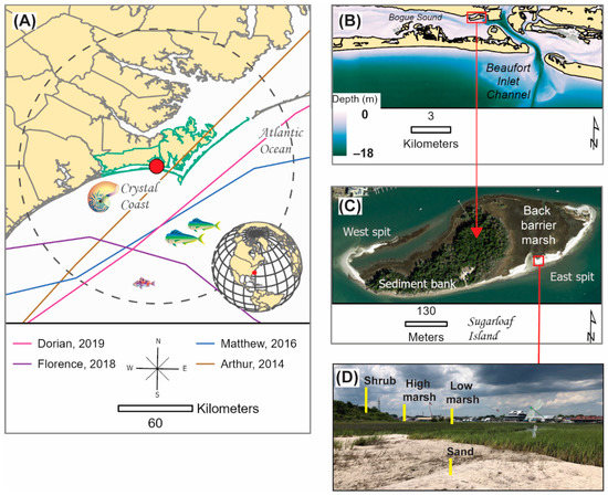 Maps of different scales of Sugarloaf Island located in North Carolina’s Crystal Coastal region. (A) The location of Sugarloaf Island is indicated by a red dot. The dotted circle denotes a 60 nautical mile radius from the Island where hurricanes passed. Hurricane-best-track data obtained from: https://www.nhc.noaa.gov/data/ (accessed on 25 October 2022), (B) 2010 bathymetry model from TCarta Marine LLC, (C) RGB aerial imagery from 2020, (D) visual line of sight captured while in the field in June 2022.