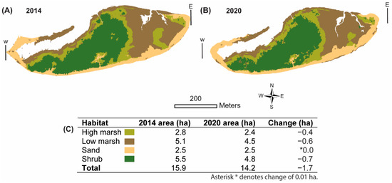 (A) 2014 habitat map, (B) 2020 habitat map, and (C) table showing the percentage of habitat decrease from 2014 to 2020. In the habitat maps, a color scheme was chosen where high marsh was assigned olive green, low marsh was leather brown, sand was medium sand, and shrub was spruce green.