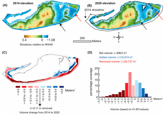 The DEMs generated from the 2014 and 2020 LiDAR data relative to MHHW are shown in Figure 4A,B, respectively. Here, shades of blue indicate where beach and low marsh habitat are inundated at higher high tide, while shades of green and brown indicate areas with higher elevation such as high marsh and shrub habitat. Based on a qualitative inspection of the DEMs, there are several areas on the Island that have had noticeable volumetric change and are highlighted in Figure 4A,B by colored arrows. Highlighted by the red arrow in Figure 4A,B, we see that in 2014, there was a small breach in the narrow foredune just to the southeast of the tidal channel, but in 2020, the dune area above MHHW had grown more robust in width and height, and the breach had been filled. To the west and highlighted by the black arrow, we see a narrow foredune exposed just above MHHW in 2014, but in 2020, overwash had created a channel cutting through the narrow foredune.
