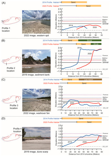 Profile 1 (Figure 5A) was extracted from the western spit area of Sugarloaf Island, where substantial changes to the Island’s morphology were observed during the study period. Minimal change in habitat type occurred along Profile 1, since this area was predominately sand in 2014 and 2020 (Figure 2A,B and Figure 5A). However, we see a marked change in the location of the spit area with its shoreline location having shifted to the east by approximately 15 m from its original location in 2014. While changes in the horizontal location of the western spit are clearly evident, the feature generally retained its overall shape and appearance, which is consistent with [39]’s conceptual profile translation model. Under nonstorm conditions, the 2014 and 2020 profiles are located within the intertidal zone, both becoming inundated by average MHHW conditions for several hours every day (Table 3). During storm conditions in our study, water levels were, on average, 2 times higher and persisted for 3.5 times longer than average MHHW conditions during nonstorm times (Table 3). The pronounced landward translation of the western spit likely occurs during high-water events that are accompanied by storm waves and is consistent with impacts expected during overwash and inundation regimes on the Sallenger Storm Impact Scale [33,34,35]. Given the low elevations in this area of Sugarloaf Island, it is highly susceptible to storms where water levels and winds are elevated for prolonged periods, such as Hurricane Florence. During Hurricane Florence, Sugarloaf Island experienced persistent tropical storm-force winds, which coincided with prolonged elevated water levels (Table 3). However, it is also important to consider the orientation of Sugarloaf Island in relation to the average wind direction. For instance, the long axis of Sugarloaf Island is oriented approximately west to east and parallel with the direction of maximum fetch within the Bogue Sound. Storms that produce winds out of the west to southwest, such as Arthur, Winter Storm, Matthew, and Dorian, could enhance wave heights on the western side of Sugarloaf Island given the additional fetch the Island experiences from that direction. It is likely that higher wave energies from the direction of maximum fetch contribute to the observed landward translation despite the lower durations of tropical winds and elevated water levels of the storms when compared to Hurricane Florence (Table 3). However, based on our synoptic dataset, it is uncertain which storm metric is most important for predicting future impacts from specific storms on Sugarloaf Island.
