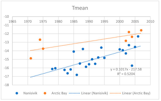 Temperature data (monthly mean temperature) were obtained from the Environment and Climate Change Canada archive (https://climate.weather.gc.ca/historical_data/search_historic_data_e.html accessed on 1 August 2023). There is a paucity of data from Arctic Bay for temperature. Seven years with complete annual records were identified: 1971, 1974, 1975, 2002, 2003, 2004, and 2007. Nanisivik, a community 13 km east of Arctic Bay has a more complete record and annual data were obtained for 1978, 1979, 1988–1995, and 2000–2006. While the absolute values differ, being colder by approximately 2 °C as illustrated in Figure 2, Nanisivik serves as a proxy with more complete data for the rate of change calculation of the annual mean temperature. The rate of change is determined by linear regression.