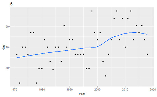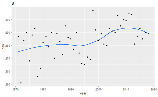 We begin by examining the representative Lowess curves for ice break-up, freeze-up, and ice-free season for points 9, 8, and 5, respectively, all points located near the hamlet of Arctic Bay (Figure 3, Figure 4 and Figure 5). Figure 3 displays a relatively linear trend toward earlier break-up of seasonal sea ice. There is considerable interannual variability as has been found in other parts of the Eastern Arctic [15,16]. For ice freeze-up (Figure 4) there is more nuance, with a substantial trend to later freeze-up dates from the mid-1990s to 2010 and levelling after 2010. This mid-1990s to 2010 accelerating of later freeze-up dates was also seen in Hudson Bay during the same period [16]. Since the ice-free period (Figure 5) is derived from the break-up and freeze-up dates, the same early 2000s increase and post-2010 levelling is evident.