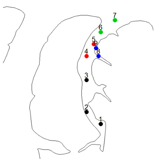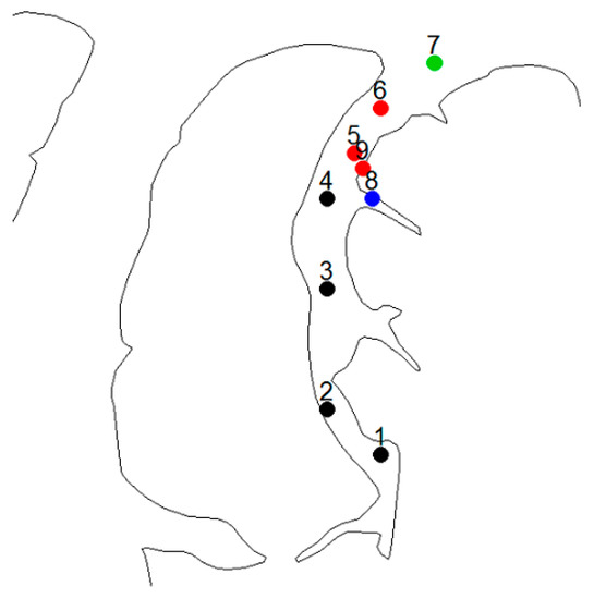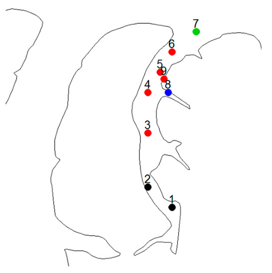Following [1], a grid of nine points was used to represent Arctic Bay. In order to determine the break-up and freeze-up dates from 1971 to 2018 for each of the sampling locations for Arctic Bay (Figure 1), the same methodology, as described below, utilized by others [15,16,17,18] was employed. Points 8 and 9 are located in waters to the south and north of the Arctic Bay community, respectively.