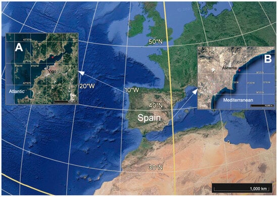 In the summer of 2016, the experimental units were placed in both locations, on the Mediterranean and Atlantic coastlines, at a distance of around 200 m from the aquaculture facilities. At this distance, the environmental conditions are very similar to those around the aquaculture installations, but distant enough to prevent any direct impact from the facilities [27,28]. In the Mediterranean location, the aquaculture facility was a fish farm (El Campello, Alicante, SE Spain: 38°25′34.7″ N 0°22′29.3″ W) producing gilthead sea bream (Sparus aurata Linnaeus, 1758), which were fed daily with pellets. The farm, which comprises 12 rounded cages and produces ~600 t per year of fish, is located offshore (2.8 km from the coast at a depth of 34 m) where oligotrophic conditions prevail. In the Atlantic location, the aquaculture facility was a mussel (M. galloprovincialis) farm (Ría de Vigo, NO Spain 42°16′35.04″ N 008°43′23.477″ W), located one km from the coast, at 12 m depth.