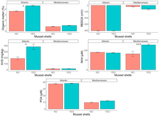 Percentage of organic matter (OM %), redox potential (mV), AVS (mg Kg−1), NH4+ (µM) and PO43− concentration (µM) in the two locations (Atlantic and Mediterranean), and for treatments with and without mussel shells. * p < 0.05, *** p < 0.0001.