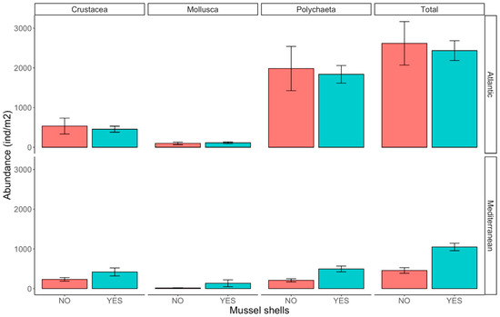 Molluscs were present in relatively low mean abundances in both the Atlantic (106 ± 92.2 ind m−2) and Mediterranean locations (75.2 ± 216 ind m−2; Table 2), followed by crustaceans (Atlantic: 496 ± 514; Mediterranean: 325 ± 282 ind m−2). Polychaetes were the most abundant group, with 19,106 ± 1440 ind m−2 in the Atlantic location and 11,306 ± 1290 ind m−2 in the Mediterranean location (Figure 3). Regarding the comparison between experimental treatments, the density of molluscs and crustaceans did not differ in relation to the presence of mussel shells (Figure 3; Table 3), but there were marginally significant differences in the numbers of molluscs between locations, and the number of crustaceans varied widely between sites. Polychaetes were significantly more abundant in the Atlantic than in the Mediterranean location (Figure 3; Table 3), and the small difference between mussel shells treatments was statistically significant (shells: 1170 ± 886 ind m−2; no shells: 1100 ± 1620 ind m−2). As the total macrofauna abundance was dominated by polychaetes, the pattern was similar, with a significantly greater abundance in the Atlantic location; however, the differences due to the mussel shells were significant only in the Mediterranean location (SNK test, p < 0.01) (Figure 3; Table 3).