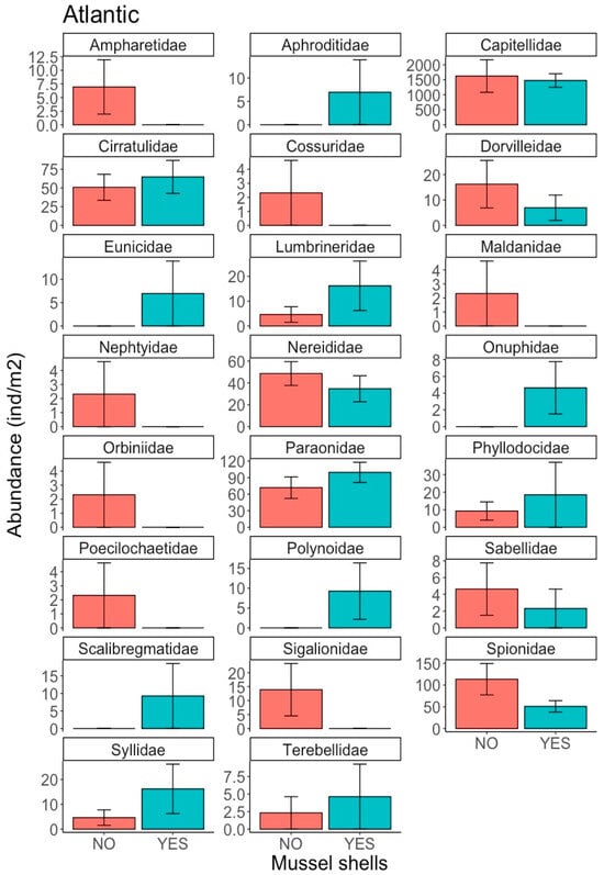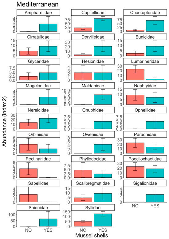 The polychaete assemblage in the Atlantic location was composed of 23 families (Table S3), with abundances of between 1550 ± 1410 ind m−2 for Capitellidae and 1.16 ± 5.67 ind m−2 for Nephtyidae. The most abundant families were Capitellidae, Paraonidae, Spionidae, Cirratulidae, Nereididae, Syllidae, Dorvilleidae and Lumbrineridae, but there were no significant differences between the treatments (Figure 4). Several families were present at very low abundances (Figure 4), with some individuals present in treatments with mussel shells (Aphroditidae, Eunicidae, Onuphidae, Polynoidae and Scalibragmatidae) and without mussel shells (Cossuridae, Maldanidae, Nephtyidae, Orbiniidae, Poecilochaetidae and Sigalionidae). In the Mediterranean location, 26 polychaete families were identified (Table S4), with abundance ranging between 1.16 ± 5.57 ind m−2 for Ampharetidae and 88 ± 77.1 ind m−2 for Syllidae. The most abundant families were Syllidae, Capitellidae, Chaetopteridae, Poecilochaetidae, Paraonidae, Nereididae, Lumbrineridae and Dorvilleidae (Figure 5). The least abundant families, only present in the treatment with mussel shells, were Ampharetidae, Magelonidae, Maldanidae, Onuphidae, Opheliidae, Oweniidae and Sigalionidae (Figure 5). By contrast, members of the Pectinariidae and Sabellidae families were only present in the treatment without shells. Capitellidae was the only family for which statistically significant differences were observed (Factor Mussel shells, p = 0.0148; Cochran’s C test p = 0.4343), with Capitellidae being more abundant in the treatment with mussel shells.