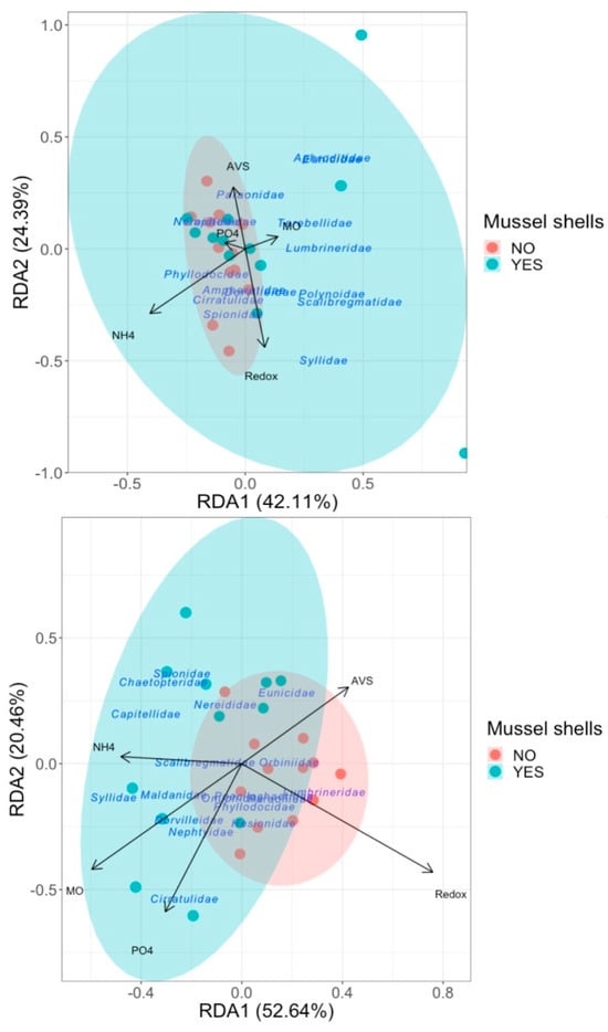 RDA plot of polychaete assemblages in relation to the physicochemical variables in the Atlantic (upper graph) and Mediterranean (lower graph) locations for both treatments with shells and without shells. The most relevant families of polychaetes in the distribution of the samples are indicated.