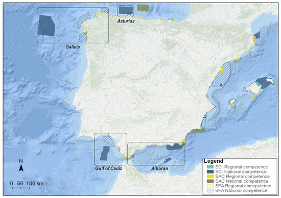 This study was carried out in different protected areas of the Natura 2000 network belonging to four contrasting marine regions (i.e., Golfo de Cádiz, Alborán, Galicia, and Asturias, Figure 1) of three marine demarcations of the Iberian Peninsula (D. of Strait and Alborán, D. South Atlantic, and D. North Atlantic). The complete list of protected area spaces is summarized in Table 1.