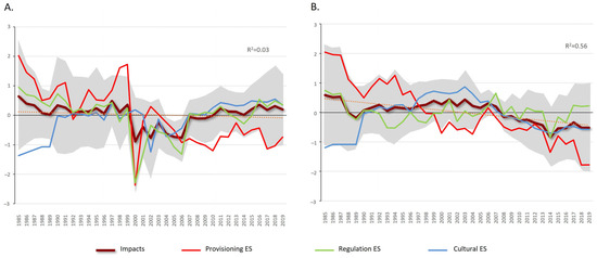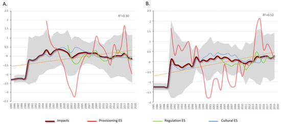 Evolution of the temporal trends of the average indicators included in the impacts (burgundy line) in the study areas: (A) Galicia and (B) Asturias. The gray shade represents the standard deviation and the dotted line the trend. Mean values of the integrated indices are also shown: provisioning ecosystem services (red line), cultural ecosystem services (blue line), and regulating ecosystem services (green line).