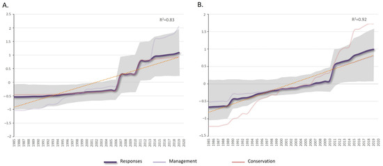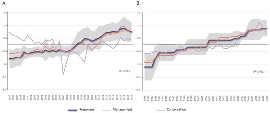 Evolution of the temporal trends of the average indicators included in the responses (purple line) in the study areas: (A) Gulf of Cádiz and (B) Alborán Sea. The gray shade represents the standard deviation and the dotted line the trend. The mean values of the integrated indices are also shown: action plans and management responses (purple line) and the development of marine protected areas as conservation responses (pink line).
