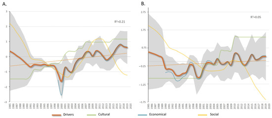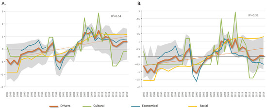 Evolution of the temporal trends of the average indicators included in the drivers (orange line) in the study areas: (A) Gulf of Cádiz and (B) Alborán Sea. The gray shade represents the standard deviation and the dotted line the trend. The mean values of the integrated indices are also shown: social drivers (yellow line), economical drivers (blue line), and cultural drivers (green line).