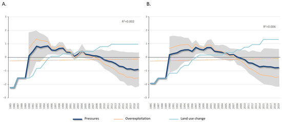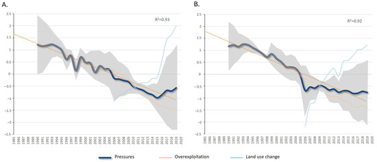 Evolution of the temporal trends of the mean indicators included in the pressures (dark blue line) in the study areas: (A) Gulf of Cádiz and (B) Alborán Sea. The gray shade represents the standard deviation. The mean values of the integrated indices are also shown: overexploitation (light orange line) and transformation of land use (light blue line).