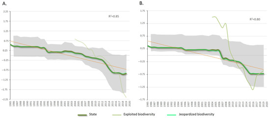 Evolution of the temporal trends of the average indicators included in the state (dark green line) in the study areas: (A) Galicia and (B) Asturias. The gray shade represents the standard deviation and the dotted line the trend. The mean values of the integrated indices are also shown: exploited marine biodiversity (dry green line) and threatened biodiversity (bright green line).