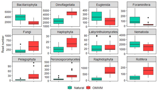 - Kalu, E.I.; Reyes-Prieto, A.; Barbeau, M.A. Community dynamics of microbial eukaryotes in intertidal mudflats in the hypertidal Bay of Fundy. ISME Commun. 2023, 3, 21. [Google Scholar] [CrossRef]