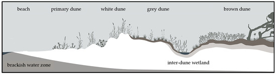 Coastal dunes are exposed to numerous ecological challenges, including nutrient and moisture deficiency, sediment transport, and salt spray [1]. These challenges create spatial dynamics within the dune: the influences of wind, sand movement, and salt stress tend to decrease with increasing distance from the sea [2]. This gradient leads to an ecological differentiation and manifests itself in a zonation pattern characterized by different vegetation types (Figure 1). Nutrient-rich, moist beachwrack piles near the waterline provide a specialized habitat for nitrophytes and create wind shelter for sand accretion. This process promotes the establishment of pioneer vegetation that marks the formation of primary dunes. Within these primary dunes, species such as Leymus arenarius (L.) HOCHST. and Elytrigia junceiformis (Á. Löve & D. Löve) HAND & BUTTLER, as well as summer annuals including Atriplex littoralis (L.), Cakile maritima SCOP., and Salsola kali (L.), find a niche. The stabilization of the sediment and the further accumulation of sand are facilitated by the rhizomes of these plants [3,4,5]. Wind drift transports sand towards the land and leads to the formation of secondary dunes, the foredunes. The sand is stabilized by the large rhizomes of Ammophila arenaria (L.) LINK and Elytrigia junceiformis. These plants can catch sand and even grow through up to 40 cm of sand if they are buried underneath [3,5]. The wind-exposed, secondary white dune is still influenced by the interplay of wind-driven sedimentation and erosion [5]. The sand is lime-rich and maintains a high pH, yet it lacks humus [2]. The wind-sheltered side of the dunes transitions into the grey dune, which is characterized by changing microclimates and soil conditions [5]. In this area, although still relatively dry and exposed to the wind, the soil is leached and humus accumulates, leading to a pH shift towards acidic conditions and an increase in soil fertility [2]. Sandy grasslands predominate here with species such as Corynephorus canescens (L.) P. BEAUV., Carex arenaria (L.), Jasione montana (L.), pioneer mosses, and lichens [3,5]. This zonation of coastal dunes is usually stable but dynamic changes and developments are possible over varying timescales. The transition from a primary dune to a white dune can occur within a few years, the shift to a grey dune can take up to 10–20 years, and further progression to a brown dune can span over 60–70 years [5]. While these dune ecosystems demonstrate resilience, interventions such as storm floods, land subsidence, and tread damage can trigger regression and alter the established zonation [5]. To a certain extent, these disturbances can maintain dune mobility and offer an ecological niche for rare pioneer species [6] but anthropogenic disturbances in particular often lead to a loss of biodiversity [7].