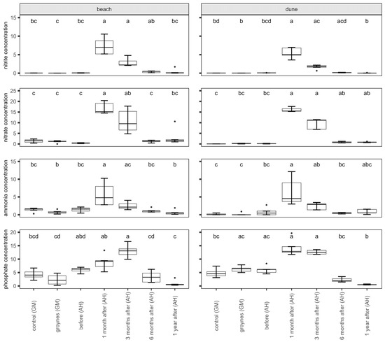There were significant changes in nutrient concentrations within the samples (Figure 3). The nitrate, nitrite, and ammonia concentrations increased after the nourishment at both the beach and the dune. The highest values were measured one month after nourishment. After that, the concentration started to decrease again. The phosphate concentration in the sediment increased after nourishment too. The highest values were measured after nourishment at both habitats. The concentration did not decrease between one and three months after nourishment. Six months after nourishment, the concentration had decreased again.