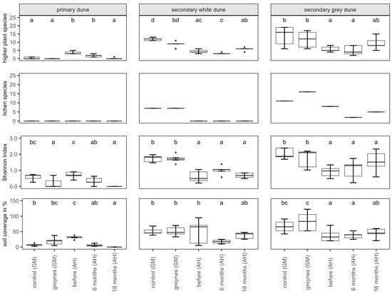 Number of higher plants and lichens, Shannon Index H, and soil coverage for each habitat (primary, secondary white, and secondary grey dune) in Ahrenshoop (AH) before, 6 months, and 18 months after the nourishment. For comparison, the species richness of two dunes in Graal-Mueritz (GM, control site, and groyne site) is pictured. Values presented by Box plots are medians (middle bar), and the lower and upper hinges correspond to the first and third quartiles (the 25th and 75th percentiles) from 5 replicates. The Box plots also include whiskers (representing 5–95% of variability) and outliers (points). Different letters indicate significant differences between sampling times (Dunn’s Test, p ˂ 0.05).