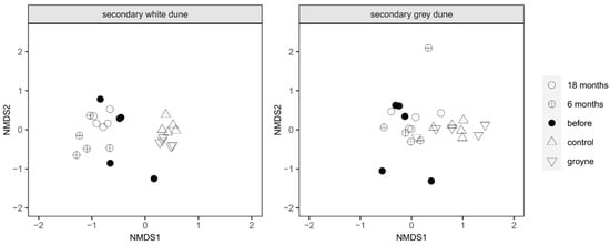 Multidimensional scaling (MDS) of the vegetation coverage on the white and grey secondary dunes at the three experimental sites and times: the nourishment site before, 6 months after, and 18 months after nourishment, with one site protected by groynes and another one without any coastal protection (control site).