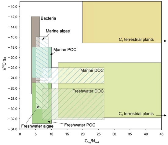 Figure 2. Carbon stable isotope (δ13C) values and carbon to nitrogen (C:N) ratios for organic inputs in coastal environments. Reproduced from [71] with permission from the British Geological Survey © UKRI 2005.