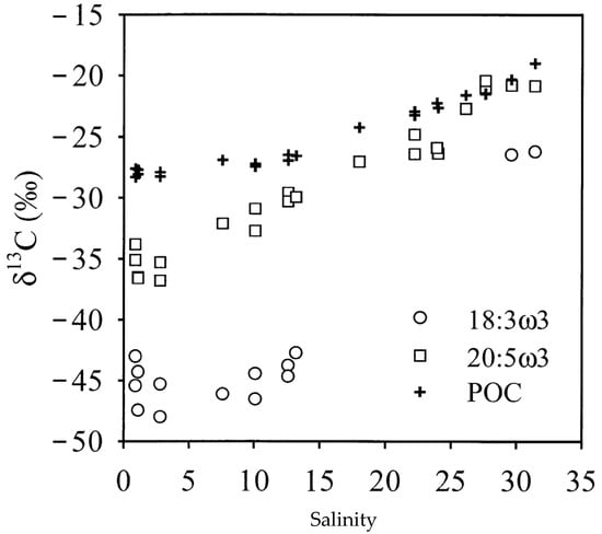 Terrestrial discharge carries large quantities of carbon and nitrogen which undergoes rapid removal and decomposition within estuaries [68]. Subsequent studies examined the application of a combined approach of stable isotopes and fatty acids to understand estuary nutrient dynamics. In a Río Negro estuary study, results showed an elevated level of 18:4ω3 and 22:6ω3 due to the influence of dinoflagellates on primary production in the estuary mouth, and higher values of δ13C signatures of organic matter which explained that detritus was from C4 plants [34]. In addition, 20:5ω3, 16:0, chlorophyll a, δ13C and C/N ratios confirmed that upper estuary primary production was driven by diatoms but through tidal export decayed diatoms become autochthones nutrient producers in coastal waters [34]. In both the upper estuary and the estuary mouth, the C/N isotope ratio of 5.7 and 5.8 indicated a strong contribution of phytoplankton to suspended particulate matter. This was confirmed by the presence of fatty acid markers 18:4ω3, 22:6ω3, 20:5ω3, and 16:0 in the same samples. A similar study was performed by [51] in the Scheldt estuary to identify phytoplankton composition and distribution using the combined methods of stable isotopes, fatty acids and pigments. Their study results revealed that diatoms (20:5ω3) and green algae (18:2ω6 and 18:3ω3) were dominant throughout the estuary and could be differentiated by fatty acids and pigments. Terrestrial vegetation or chlorophyte markers 18:2ω6 and 18:3ω3 together with significantly higher isotope values and C/N ratio (approximately −45‰) in the upper estuary suggested that there was little contribution of macrophytes to the upper estuary from terrestrial suspended particulate matter [34]. The study of [51] identified that diatom markers gradually changed with isotopic ratio along the estuary, becoming more positive downstream (δ13C was approximately −35‰ in the upper estuary and −20‰ in the lower estuary) which may have been due to dissolved inorganic carbon isotopes (Figure 3). Both [34,51] revealed that upper estuary bacterial fatty acids and terrestrial origin particulate organic carbon had similar isotope signature values, while estuary mouth bacterial and phytoplankton isotope signature values were similar. These differences in fatty acid profile and isotope signature values were possibly due to upper estuary organic carbon sources originating from sewage and terrestrial matter, while lower estuary organic carbon sources originated from autochthonous phytoplankton. Overall, studies of fatty acid and isotope values C/N ratio revealed the upper estuary’s major organic matter producer was allochthonous origin terrestrial organic matter though, estuary mouth autochthonous phytoplankton were the primary organic matter sources [72,73,74].
