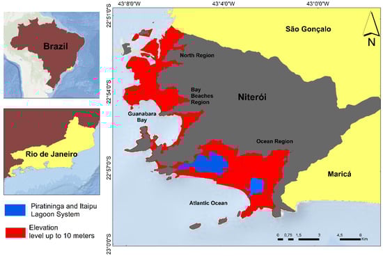 Preliminarily, the shapefile of Niterói’s coastal strip up to 10 m high, considered critical in terms of vulnerability to rising sea levels [4,5], was created using the ArcGis platform. The municipality’s contour lines, produced by LIDAR (Light Detection and Ranging) technology and taken from the SIGeo-Niterói website [33], were used for the delimitation.