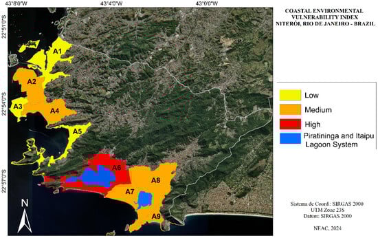 The results obtained from the application of the coastal environmental vulnerability analysis matrix—CEVI-, along the coast of the municipality of Niterói, in the nine analysis areas, are shown in Table 4 and illustrated in Figure 4.