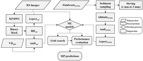 Flowchart of the steps in the methodology used in this research. RS: orbital remote sensing images; MNDWI: modified normalized difference water index; HDsat: horizontal distance derived by satellite; VDsat: vertical distance derived by satellite; tanβsat: slope derived by satellite; GNSS: global navigation satellite system; tanβGNSS: slope derived by GNSS; ML: machine learning models; MP deposits: microplastic deposits.
