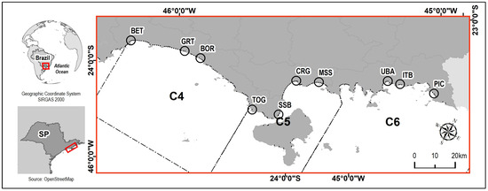 Location of the compartments on the São Paulo coast: (C4) Bertioga–Toque-Toque; (C5) Toque-Toque–Tabatinga; and (C6) Tabatinga–Picinguaba [39,40]. The circles are the sampling locations distributed within the compartments of the northern coast of São Paulo.