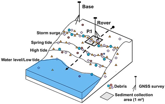 Beach sampling point (P1), modified from [3]. Examples of GNSS base, rover surveys, and area (1 m2) of superficial sediment collection.