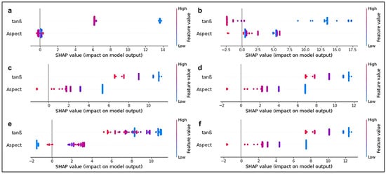 The SHAP plots in Figure 4 show the impact of the variables tanβ and Aspect on predicting MP deposition. In the RF plot (Figure 4a), tanβ shows the most significant positive impact, with high values significantly contributing to an increase in predictions, while Aspect has a less pronounced impact. For GB (Figure 4b), the effect of tanβ is even more prominent, with a precise distribution of values reinforcing its critical role in the model, indicating that high values of this variable considerably increase predictions. In the Lasso model (Figure 4c), tanβ remains the most influential variable, although the overall impact is more distributed across low and medium values, suggesting a more linear relationship. The Ridge plot (Figure 4d) is similar to Lasso’s. However, it shows a smoother impact variation, indicating that both variables contribute in a balanced way, though tanβ still plays a more dominant role. In the SVR model (Figure 4e), tanβ again stands out, with high values associated with a more pronounced positive impact. At the same time, Aspect has a less significant and more scattered effect, suggesting a less consistent contribution to predictions. In the PLS model (Figure 4f), the impact of tanβ is visibly more considerable and well-distributed across values, reinforcing its importance in the model’s structure. At the same time, Aspect maintains a less significant yet relevant effect. These results indicate that tanβ is the most important variable in modeling MPs/m2 deposition on sandy beaches, regardless of the model used. At the same time, the aspect has a smaller influence, except in specific situations, such as during storm surges caused by cold fronts [2,20,35].