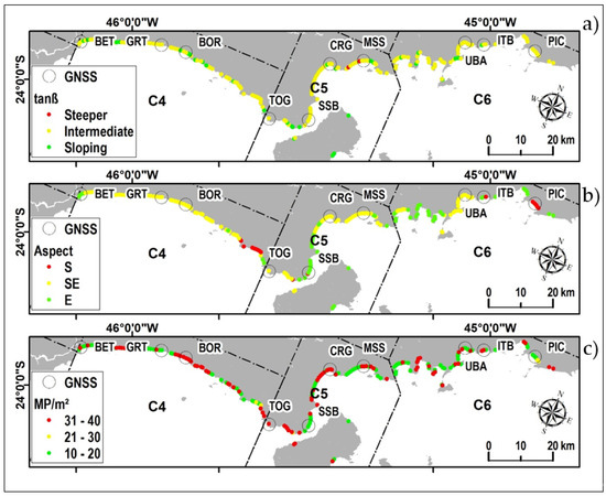 Transect observations of GNSS transects; (a) beach slope (tanβ); (b) beach face direction (Aspect); and (c) microplastic deposition GB model per square meter (MP/m2).