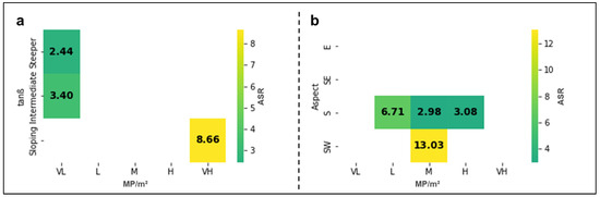 Perceptual maps showing the Adjusted Standardized Residuals (ASR) values between the microplastic deposition model (MP/m2), (a) beach slope (tanβ) and (b) orientation of the beach face (Aspect). The colored cells indicate significant relationships between variables (+1.96 ≤ good ASR). VL (very low), L (low), M (medium), H (high), and VH (very high) represent the different levels of MP/m2 deposition by CA analysis.