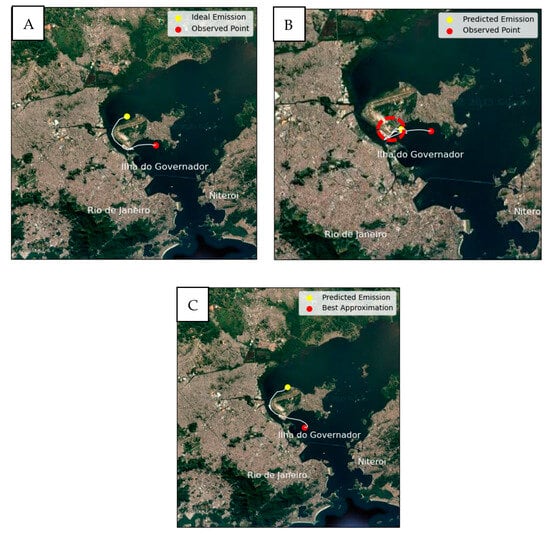 Nevertheless, identifying the source of an emission based on observation can be a challenge [,,]. Common strategies used in publications attempt to backtrack the particle using a solution based on inverting the current velocity fields [,]. This approach simulates a reverse motion of the hydrodynamic flow, allowing passive particles to drift backward in time. Other authors have attempted to reconstruct the flow field v(x, y) at each spatial location (x, y) []. The process of identification started by observing the motion of neutrally buoyant particles (Lagrangian tracers). These tracers are carried passively by the flow, and the paths are recorded as X(t) = (X(t), Y(t)), representing the x and y coordinates of the particles over time. The core principle connecting the tracers’ motion to the flow field used by the authors is that a tracer’s instantaneous velocity is equal to the fluid velocity at its current location. Mathematically, this is expressed as dX/dt = v(X(t), t), which represents the rate of change of the tracer’s position as equivalent to the flow field’s velocity evaluated at the tracer’s position []. Thus, by analyzing the observed trajectories of multiple tracers, it was possible to solve this inverse problem and infer the underlying flow field v(x, y) that generated the observed particle motions. However, these solutions may be challenged by inevitable error accumulation that can change the route of a simulated contaminant and fail to accurately represent the emission over longer time scales [,,].