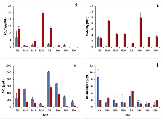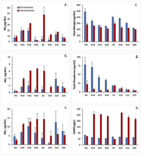 Pre- and post-hurricane (August 2022 and October 2022) concentrations for (a) ammonia (NH3) (b) nitrite (NO2−) (c) nitrate (NO3−) (d) orthophosphate (PO43−) (e) silica (SiO2) (f) total nitrogen (g) total phosphorous (h) chromophoric -dissolved organic matter (CDOM) (i) turbidity and (j) chlorophyll a averaged across three depths (surface, middle, bottom) for each site along the north transect (N5–N20) and south transect (S5–S20). Error bars are S.E.M. (N = 3).