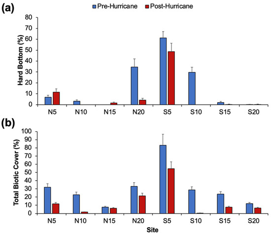 Benthic cover composition by site and date as determined by video monitoring. Pre-hurricane and post-hurricane dates were August 2022 and October 2022, respectively. Error bars are S.E.M. (N = 20). (a) Hard bottom cover. (b) Total biotic cover.