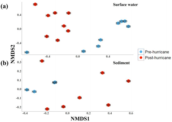 Non-metric multidimensional scaling (NMDS) of microbial community samples taken from all sites pre-hurricane (August 2022, blue marks) and post-hurricane (October 2022, red marks). Ordination is based on Bray-Curtis dissimilarity. Panel (a) surface water microbial community NMDS (stress = 0.088). Panel (b) surface sediment microbial community NMDS (stress = 0.138).