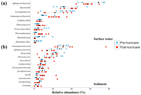 Microbial relative abundance by taxonomic class, sample type (surface water or sediment), and date for all sites sampled. Pre-hurricane and post-hurricane dates were August 2022 and October 2022, respectively. Each point represents a sample. Black points represent the median relative abundance of each class pre- and post-hurricane, and the black line represents the inter quartile range (IQR). (a) Top 10 taxa at the class level in surface water microbial communities. (b) Top 12 taxa at the class level in surface sediment microbial communities.