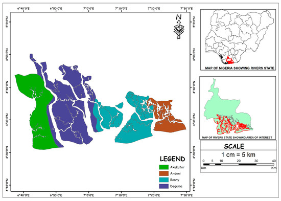 One of the largest deltas in Africa is situated in the southeastern sector of Nigeria’s coastline (Figure 1) [40]. Geographically, it is low-lying and covers about 2.8% of the landmass, with its northern part extending south of Onitsha, a western portion bordering the estuary of the Benin River, and an eastern part abutting the estuary of the Imo River. The climate is affected by both the dry and warm northeast airmass that blows across the country from November to February and the warm and wet southwest air mass that brings rain from March to October. The region also experiences seasons of storm surges between the months of November and February.