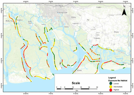 The InVEST CV model, version 3.10.2 was used in the study to evaluate the coastal exposure along Rivers State coast [41]. The objective was to evaluate the contribution of mangrove habitats to flood reduction in coastal areas, (Figure 2) shows a schematic diagram of how the model works. The model was used to pinpoint communities that are more exposed to flood and regions where mangroves have the best chance to shield coastal residents from flood. The main output is a vulnerability map showing areas of low, intermediate, and high exposure (Figure 3, Figure 4, Figure 5 and Figure 6). The InVEST CV model was used as it (1) considers the biological and geophysical aspects of the region and (2) has a minimal data requirement suitable for data-poor countries. The model is based on the assumption that coastal habitats provide a strong defence against flood risk [42], and this ranking is based on the understanding that healthy habitats provide more protection than degraded habitats [43]. It also assumes that habitats that penetrate the water column like the mangroves offer greater protection than the weak and seasonal habitats like the salt marshes [44]. The model inputs include raster and shapefiles of bathymetry, natural habitat (mangrove), continental shelf, shoreline geomorphology, and digital elevation model (DEM) (see Table 1) whereas the outputs are the vulnerability maps (see Figure 3, Figure 4, Figure 5 and Figure 6 and Table 2) and (Figure 2) shows a schematic diagram of how the model works.