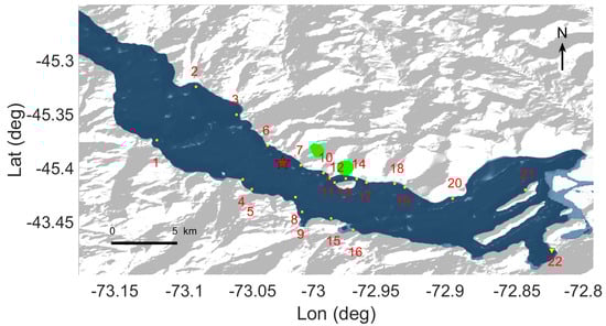 Figure 8 is the difference in arrival times (approximately 3 min) between Stations 1 and 22, despite their similar distances with respect to Station 13. This can be attributed to the presence of two islands in front of Chacabuco Port. These islands act as barriers, hindering the free movement of the waves and causing a delay in their arrival at the station.