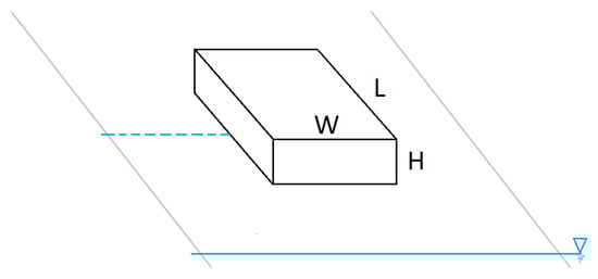 Figure 5 illustrates the shape of the representative landslide to be modeled in the NHWAVE, along with its respective geometric variables. The modeling of the landslide is based on the distance between its centroid (indicated by a segmented line) and the sea level (marked with a triangular symbol). The gray line represents the slope on which the landslide moves.
