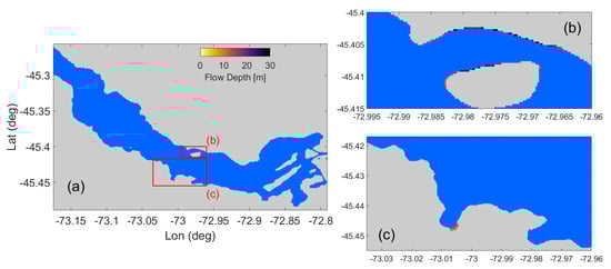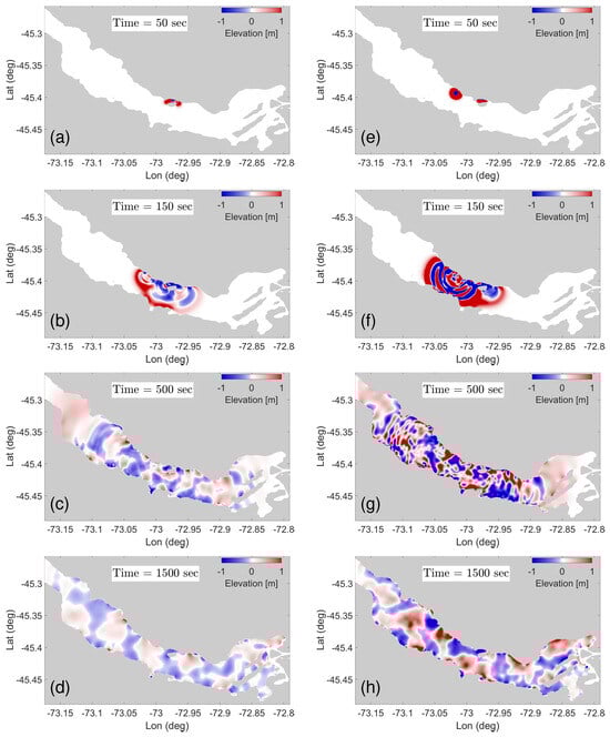 Figure 8b–d reveal a rapid decline in the absolute water surface amplitude. This behavior is characteristic of near-field tsunami waves, which are highly localized events. In contrast, far-field tsunamis exhibit smaller amplitude waves that travel in packets with a wider range of frequencies (frequency dispersion). Another interesting observation from