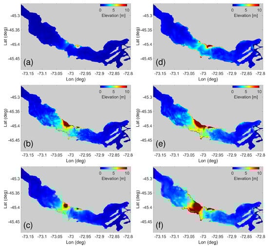 Figure 7b,c. Additionally, comparing landslides with and without basal friction (e.g., E3–E4 and E5–E6) demonstrates that scenarios lacking basal friction exhibit a greater impact of the tsunami, reaching higher maximum elevations.