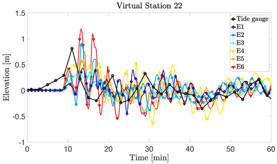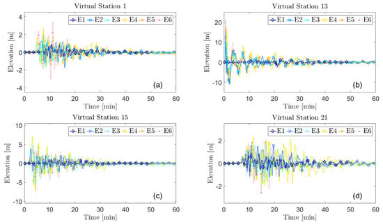 A distinctive pattern in all time series, especially at virtual stations located near the source, is a rapid decrease in the absolute value of the water surface elevation. This shows that the area near the source experienced a strong impact from the tsunami. While the water elevation in distant areas is lower, the interaction with the coast (reflection, for example) prolongs the wave propagation for several minutes. In addition, our simulations indicate that the arrival time of tsunami waves at the Chacabuco Port tide gauge is approximately 10 min, with scenarios E3 and E4 showing the best agreement with the tide gauge records (