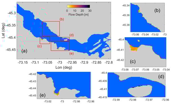 Figure 15 present the inundation zones resulting from the simulated tests. Red boxes highlight the areas of greatest interest in each figure. E1 proves to be the least destructive event, with a single inundation zone north of Mentirosa Island and a maximum estimated height of 10 m. As the magnitude of the volume landslide increases (E4 and E6), a significant increase in the extent and height of the inundations is observed. In these scenarios, wave heights greater than 30 m are recorded north of Mentirosa Island and close to 7 m south. In addition, a concentration of flooded zones is identified near the area enclosing points of observation 4 to 19, and outside this area, flood heights are less than 5 m (except for scenarios E4 and E6). These results demonstrate the strong influence of the volume of the granular landslide on the extent and severity of the inundations.