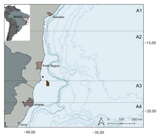 Sampling areas of Lutjanus jocu specimens. A1—Salvador (n = 32), A2—Porto Seguro (n = 37), A3—Abrolhos (n = 41), and A4—Espírito Santo (n = 15).